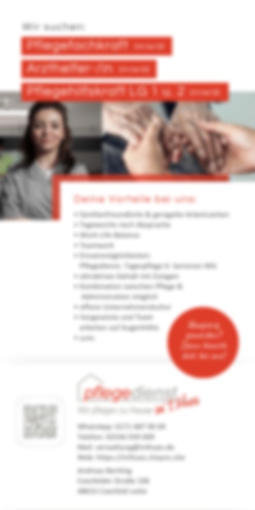 Wir sind der Pflegedienst int´Hues - ein Familienunternehmen, in dem du die Möglichkeit hast, dich weiterzuentwickeln. Wenn du Lust hast bei uns in der ambulanten Pflege, der Betreuungsgruppe „Augenblicke“, der Tagespflege Zur Alten Gärtnerei GmbH, im Team Hauswirtschaft, oder in der Senioren Wohngemeinschaft zu arbeiten, dann hast du unten die Möglichkeit direkt und unverbindlich Kontakt zu uns aufzunehmen. Bei uns zählt nicht nur der respektvolle Umgang miteinander, sondern auch eine überdurchschnittliche Vergütung auf die du dich verlassen kannst.